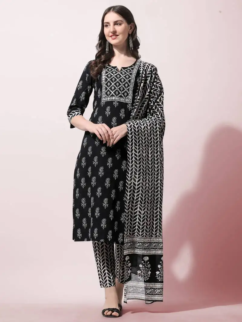 Black cotton mirror embroidery printed kurta with pant and dupatta stitched