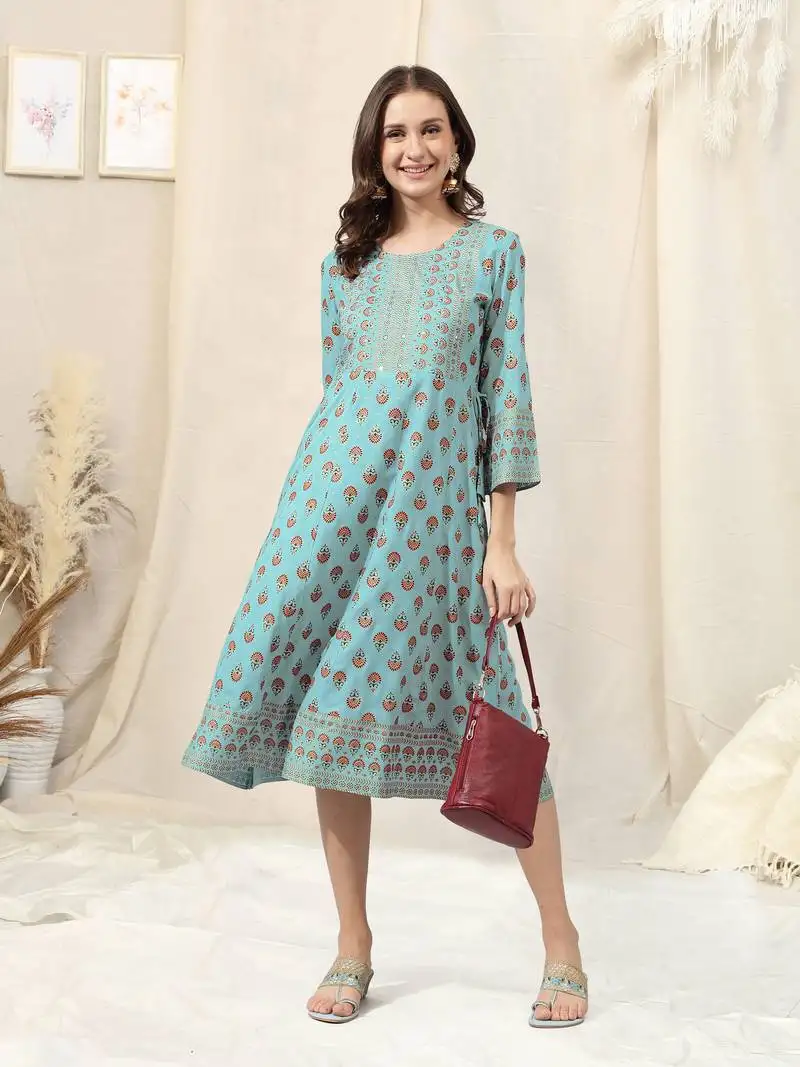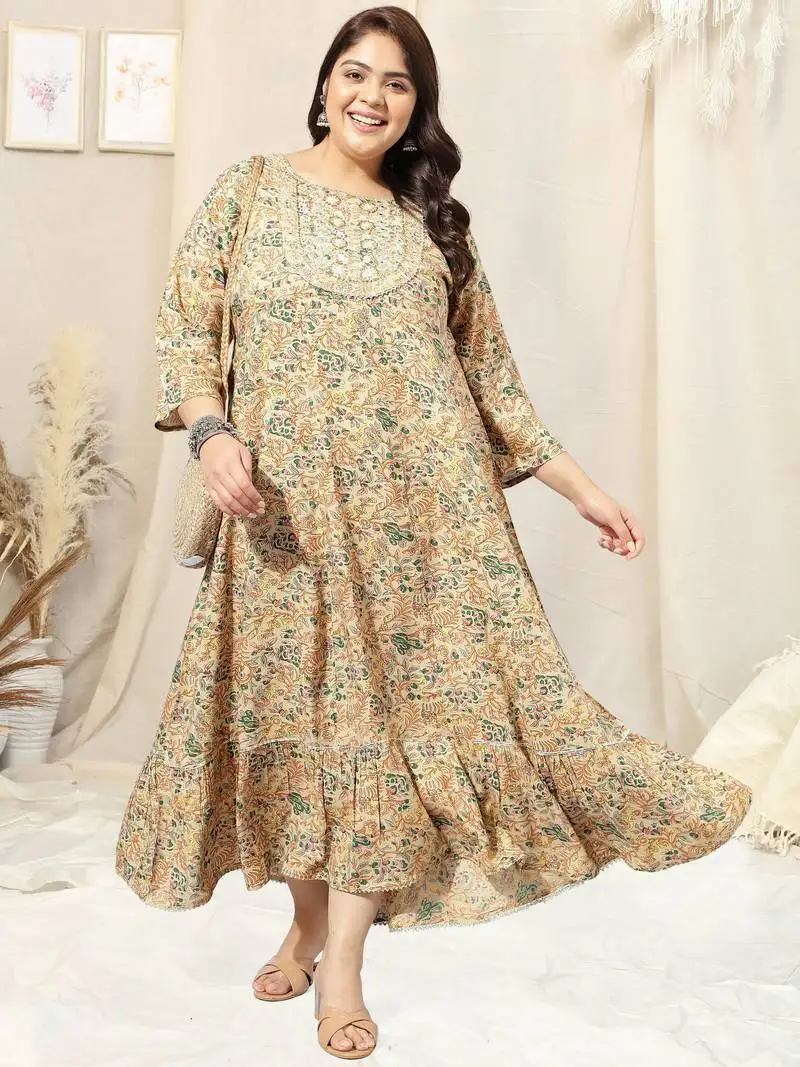 Beige green floral print embroidery hand work anarkali rayon kurti stiched kurta