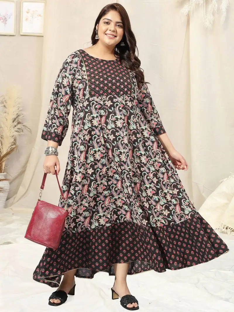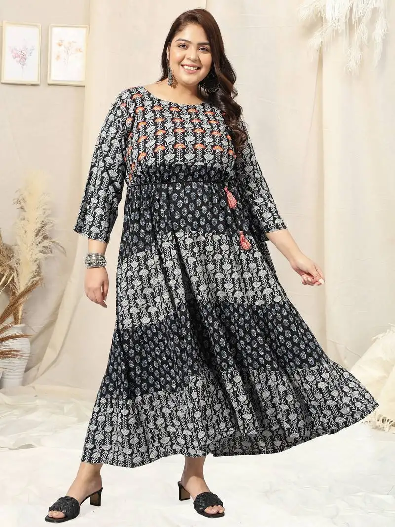 • Black grey floral print block print hand embroidery flared rayon kurti stiched