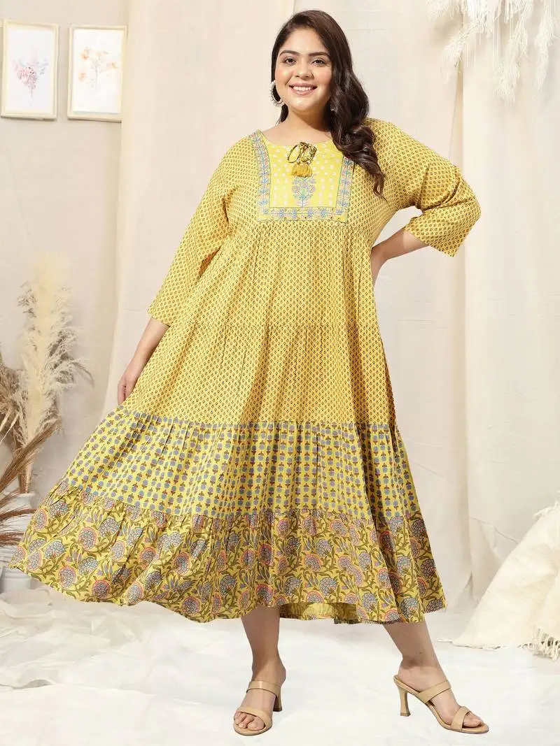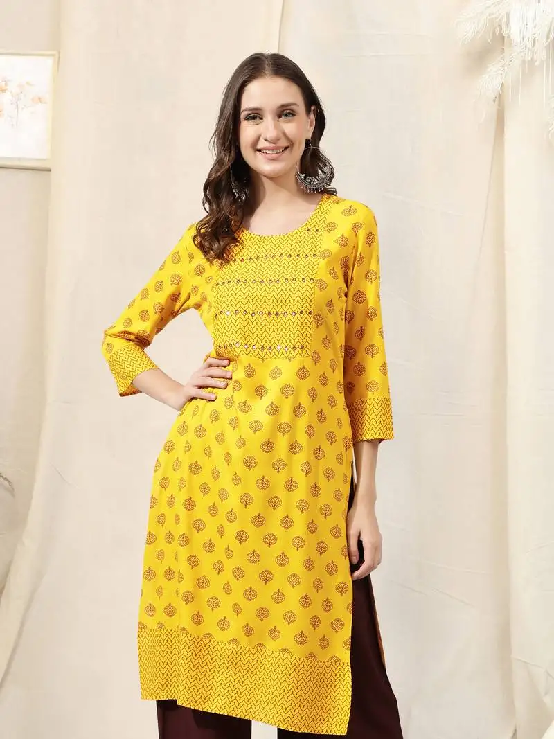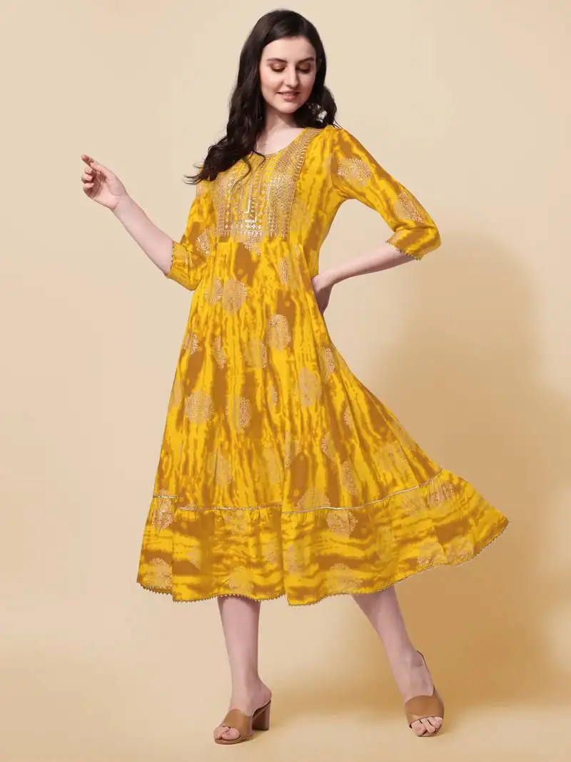 Sale!Yellow turquoise jaipuri floral print mirror embroidery flared rayon kurti stiched kurta