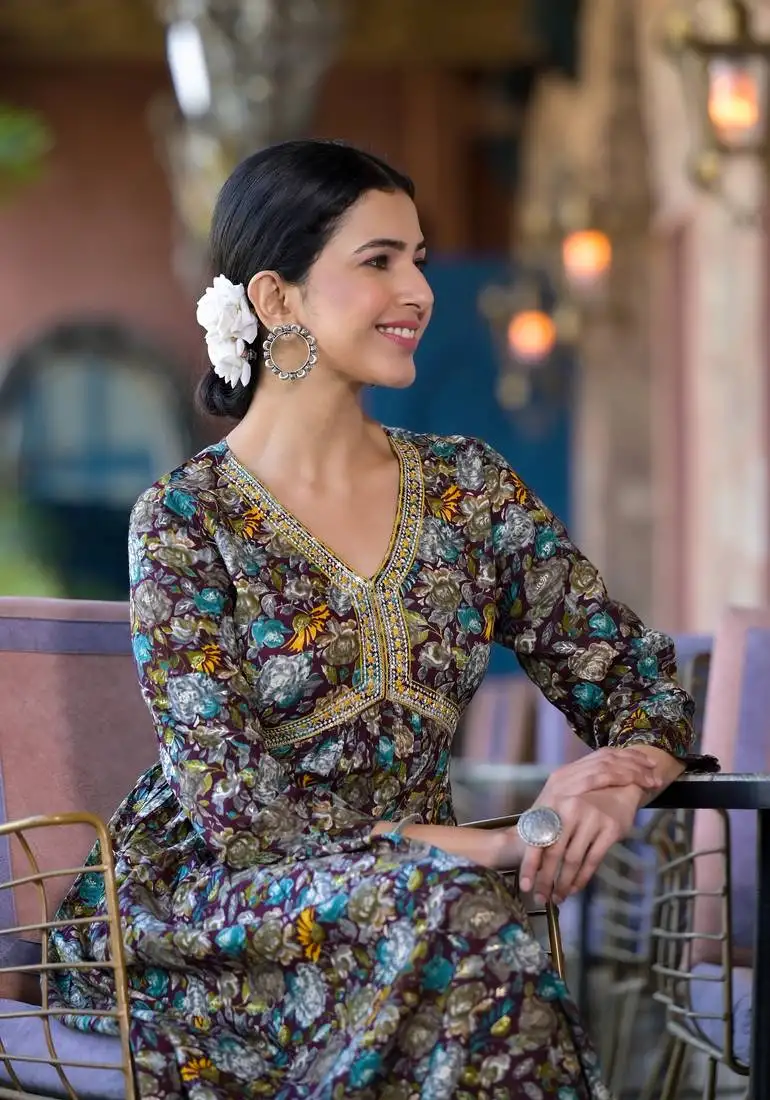 Sale!Wine,multicolor floral print mirror work rayon alia cut kurta