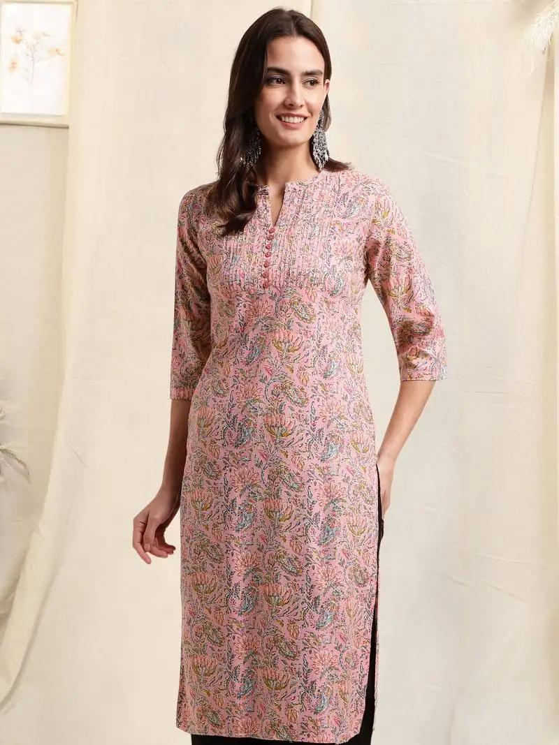 Sale!Pink sky blue rayon jaipuri floral print pintuck buttons kurta for women