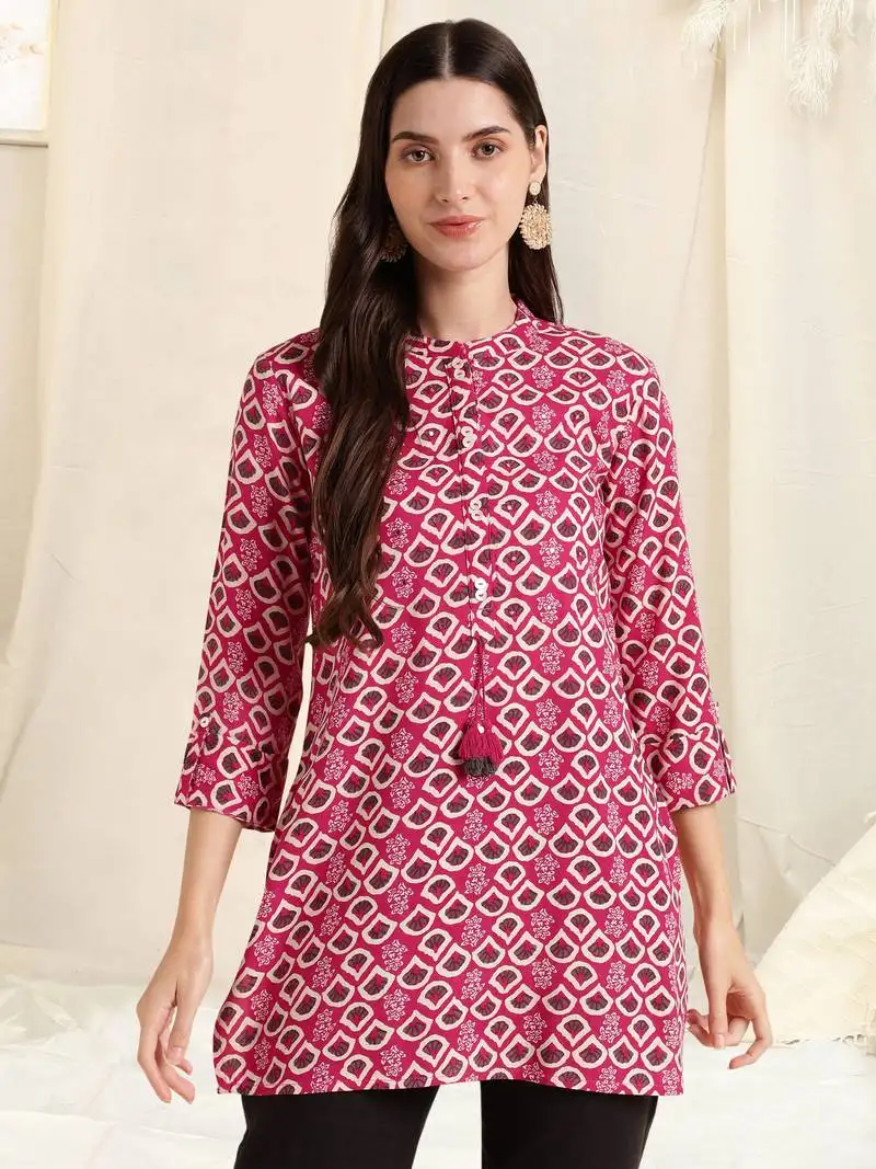 Sale!Pink golden rayon jaipuri print foil print block print mirror work round neck tassel kurta for women