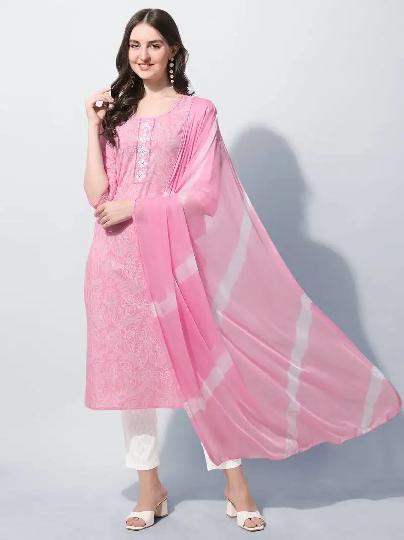 Sale!Pink cotton thread embroidery printed kurta with pant and dupatta stitched