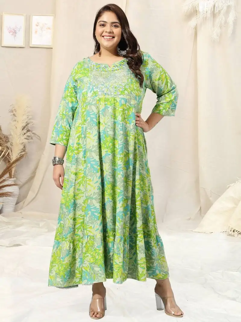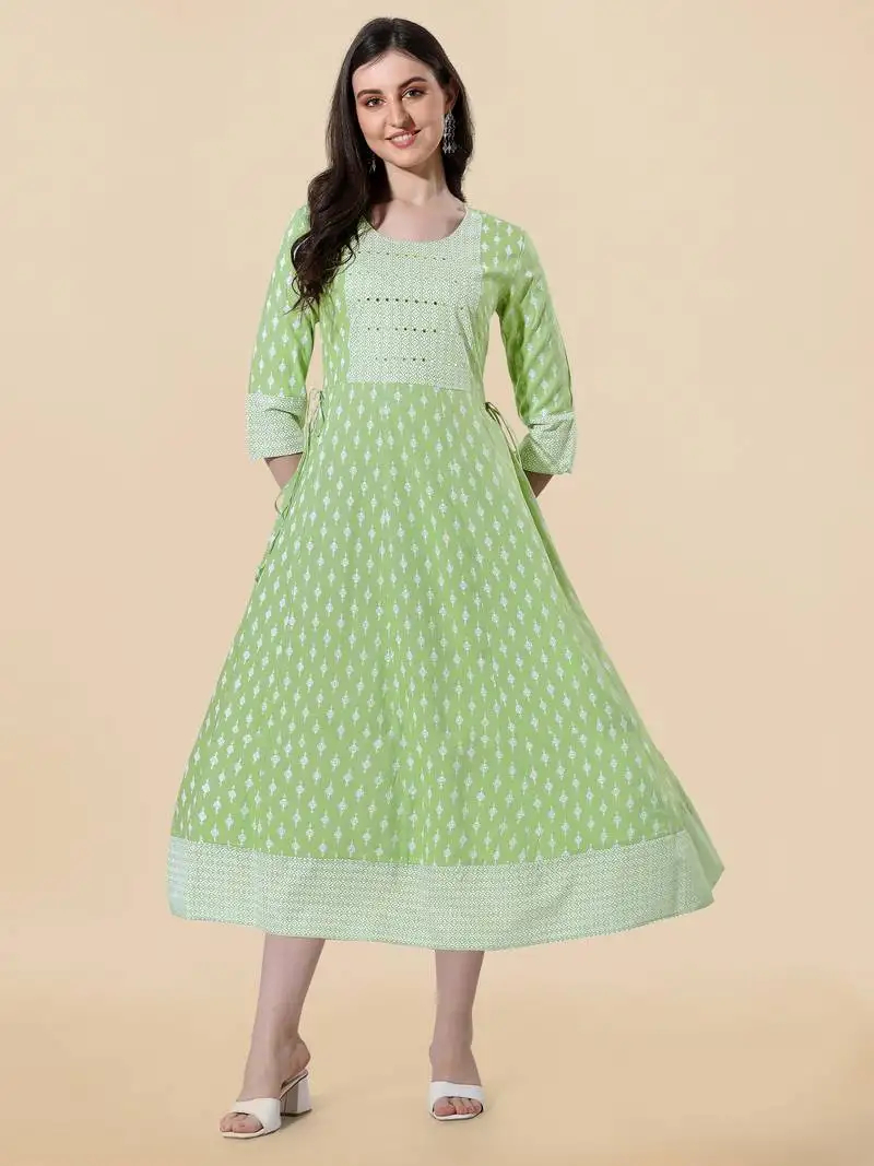 Sale!Pista green turquoise leaf floral print zari mirror embroidery anarkali rayon kurti stiched