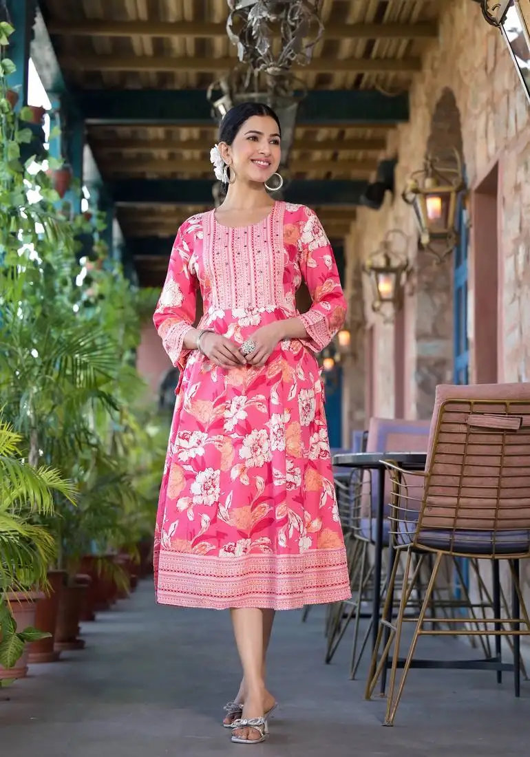 Sale!Pink cotton solid round neck 3::4 sleeve anarkali pattern printed frill border kurta for women