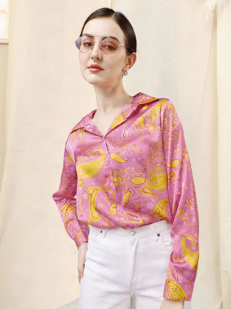 Sale!Pink yellow paisley print button placket satin stiched shirt
