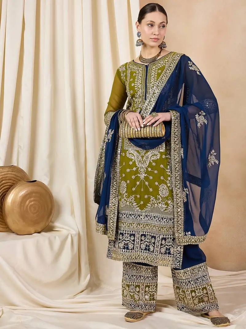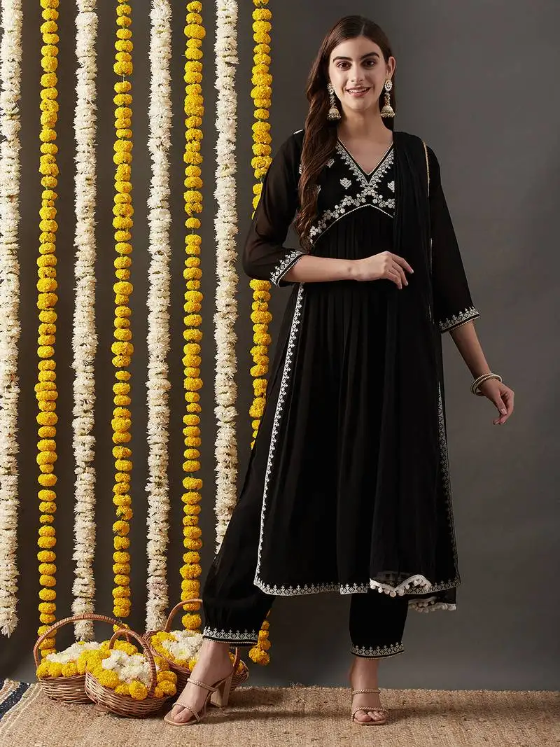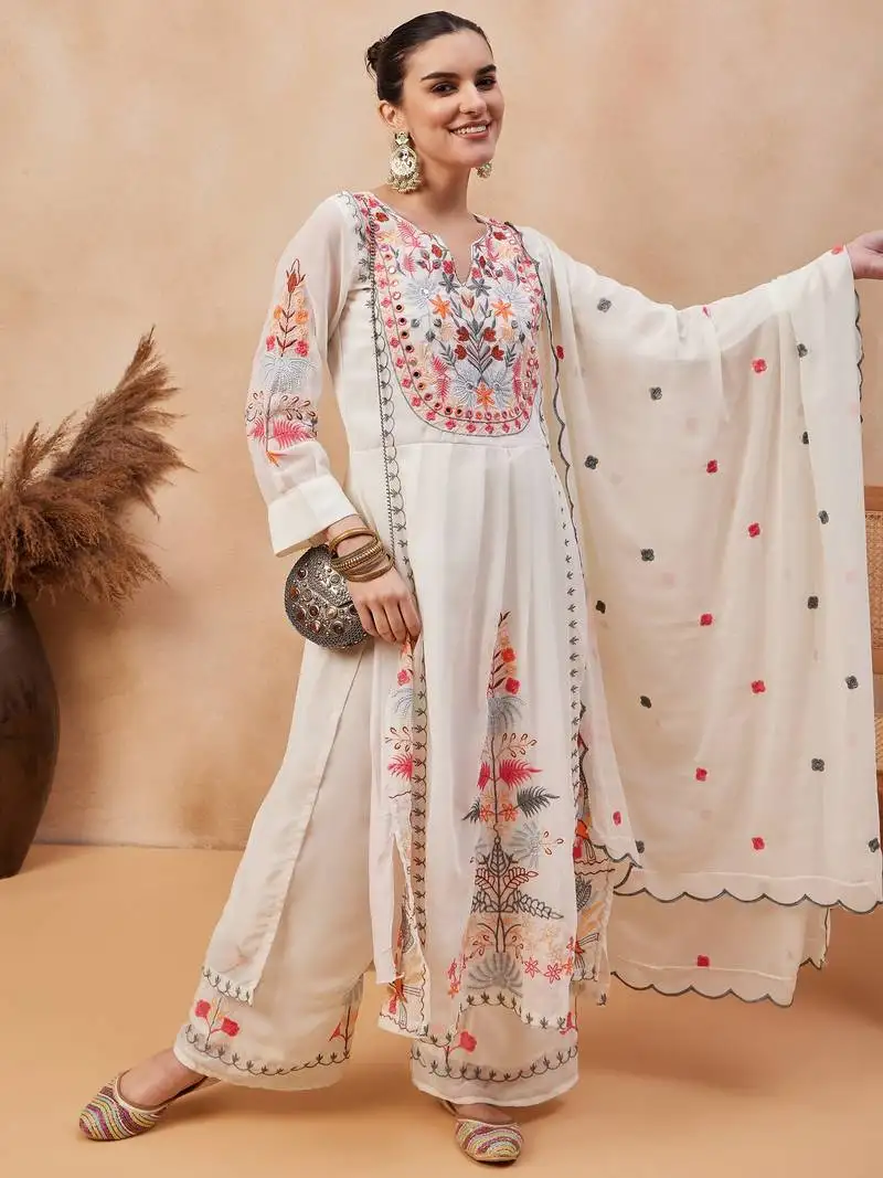 • Rajgranth women's faux georgette fabric embroidered kurta set with duppata stitched
