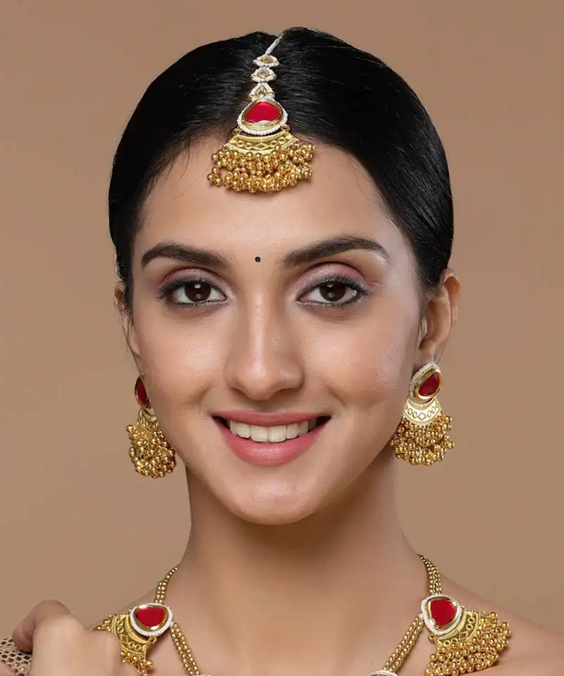 Sale!Red & gold adjustable head jewellery with kundan & pearls