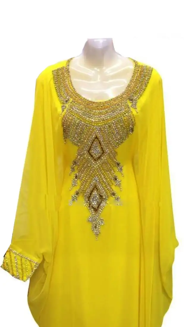 Sale!Yellow beads and stone work georgette hand stiched arab moroccan kaftan