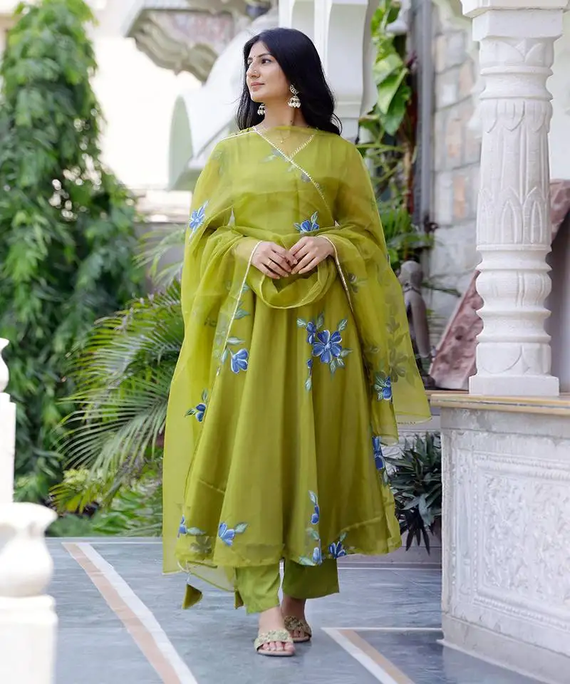 Sale!Mehendi green handpainted suit set