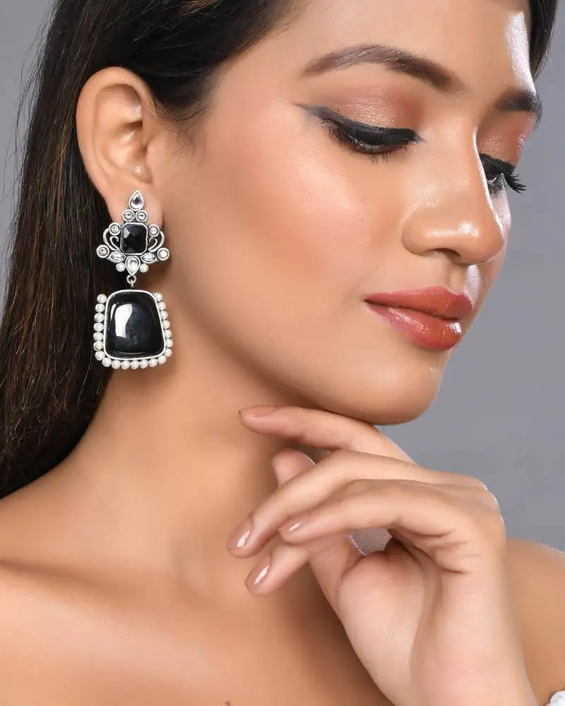 Sale!Gold plated white pearl black stone drop earring