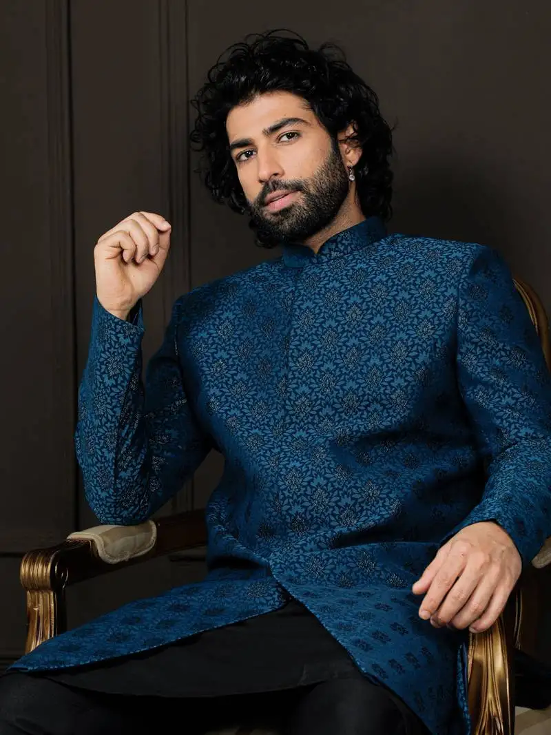 • Blue viscose men's sherwani with woven work