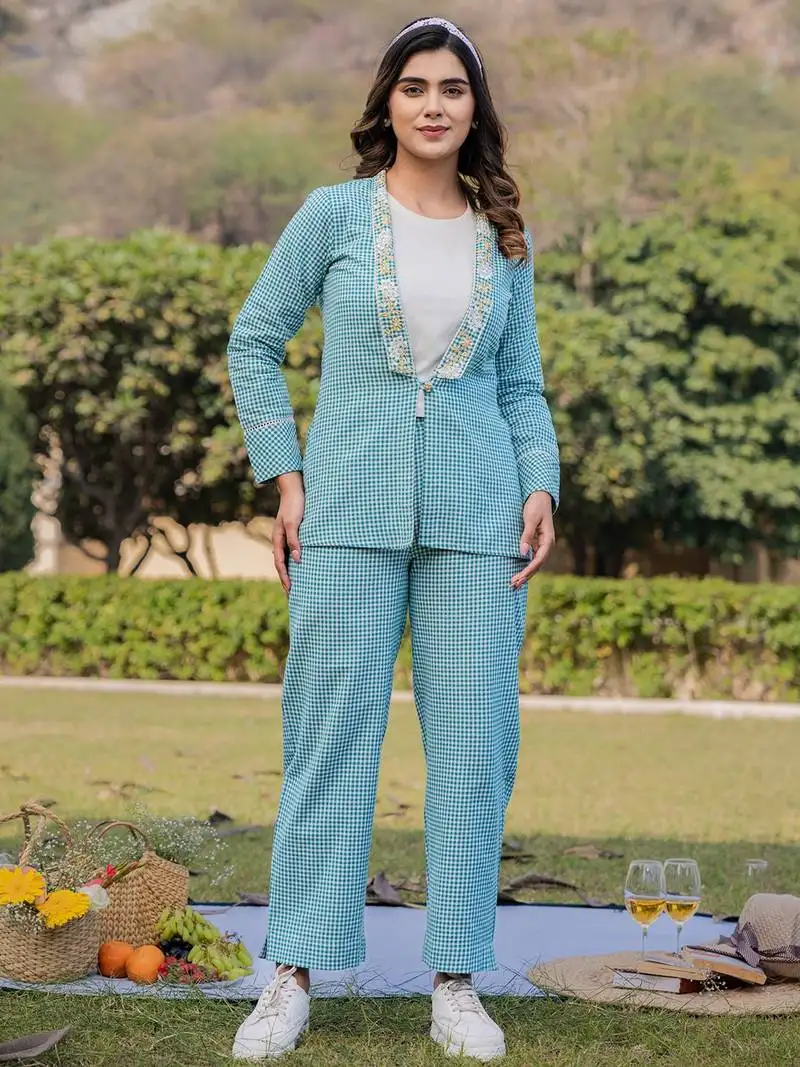 weaved cotton checks print shawl neck co-ord set with embroidery