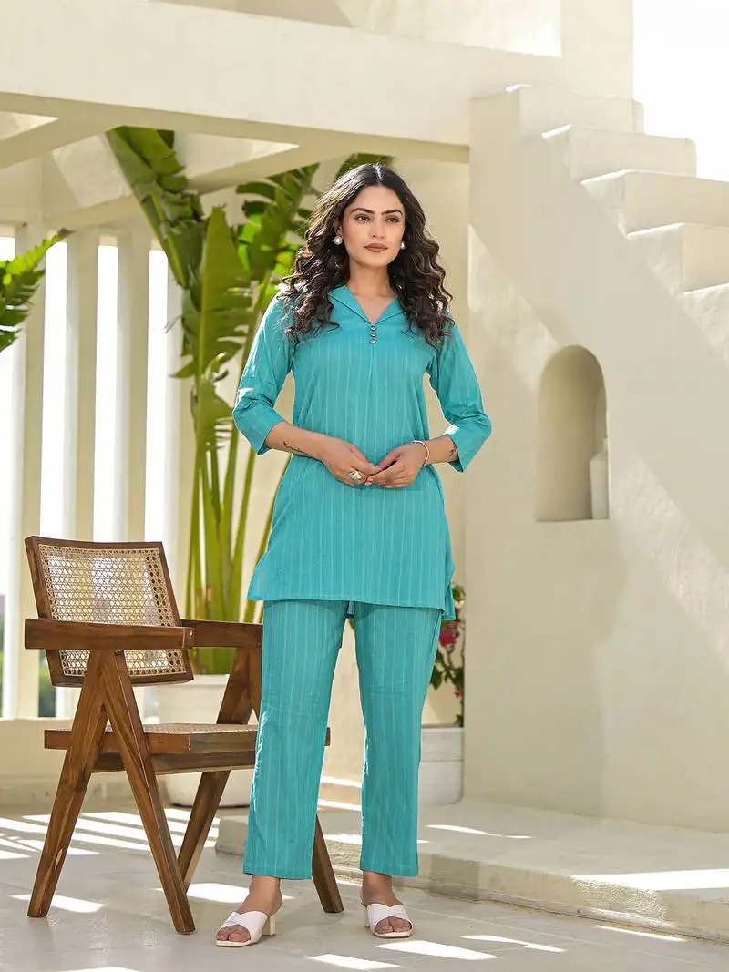 turquoise blue cotton ethnic motifs striped print co-ord set