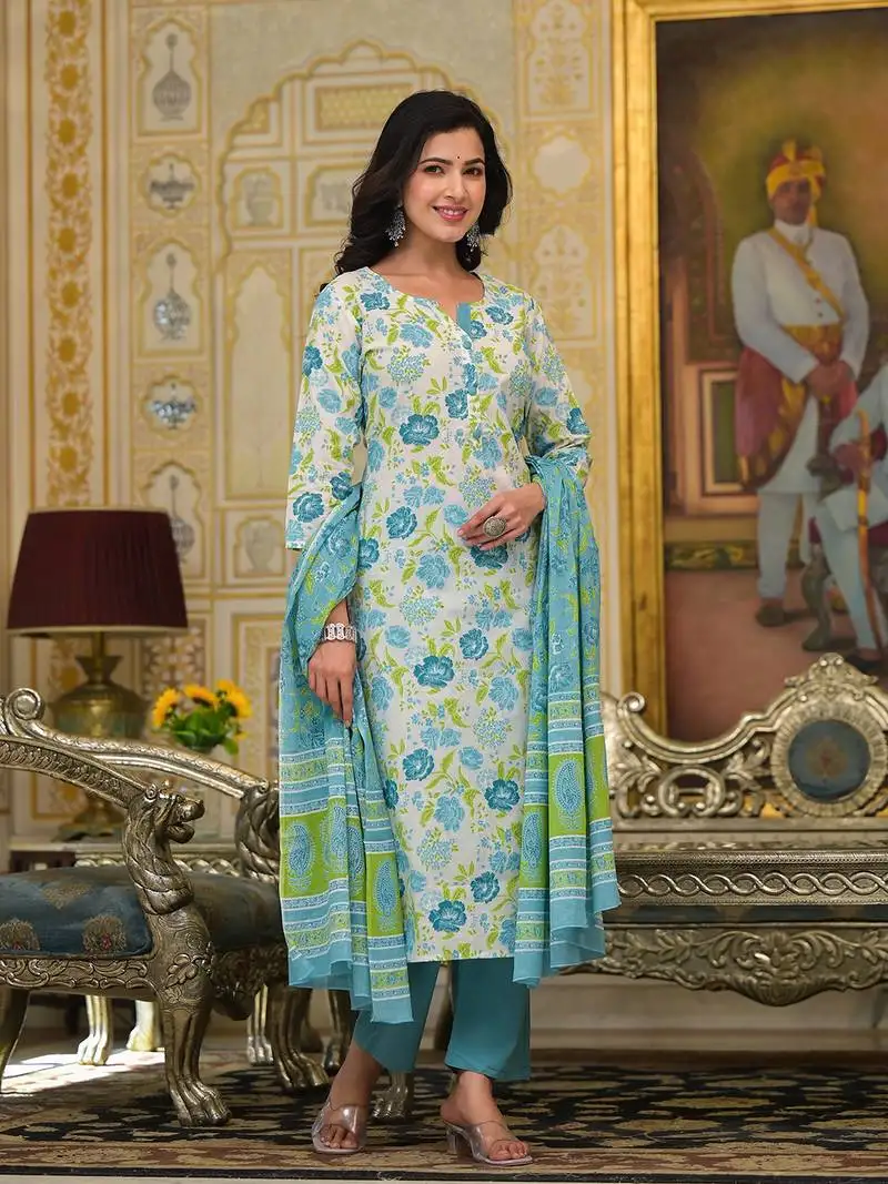 • teal green floral print straight button show on yoke kurta trouser and dupatta set