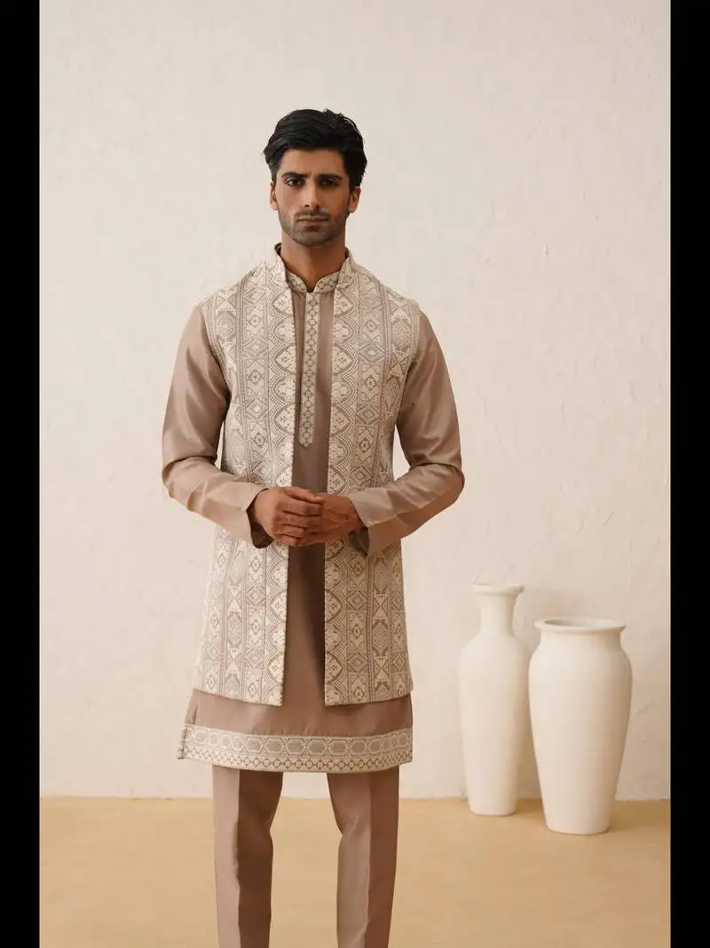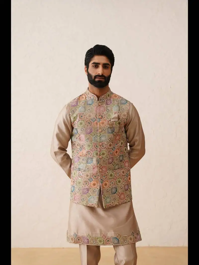 Be the first to review “Beige silk sherwani for wedding featuring resham embrodiery”