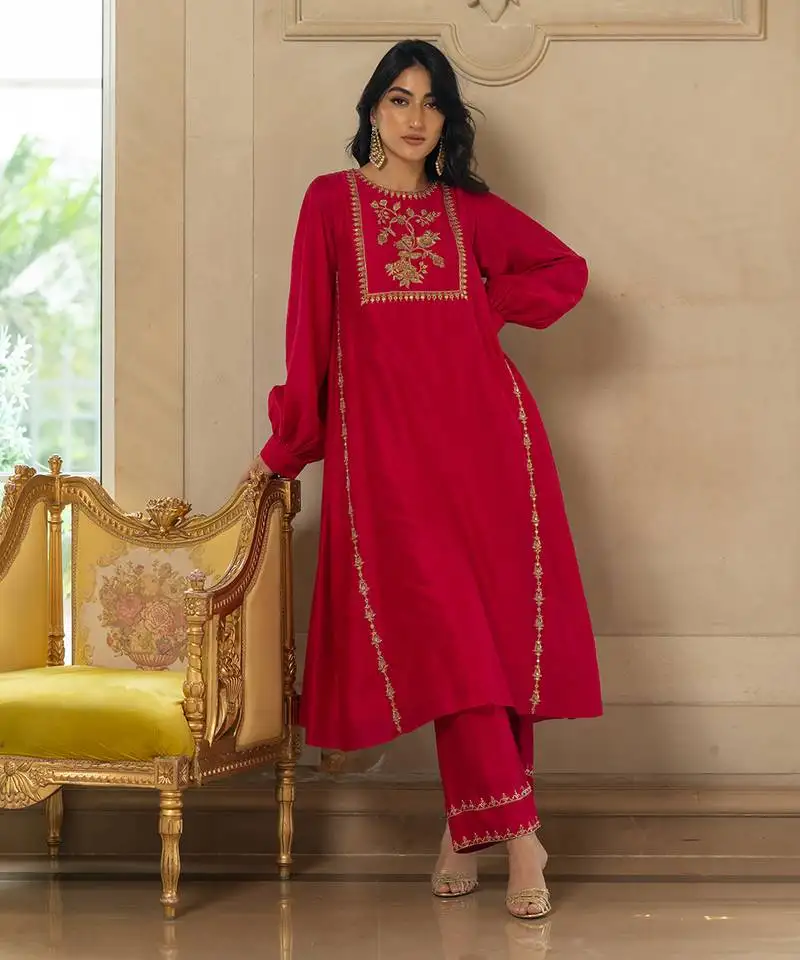 Petrol rayon slub fabric embroidered work straight cut kurta, pant and dupatta set