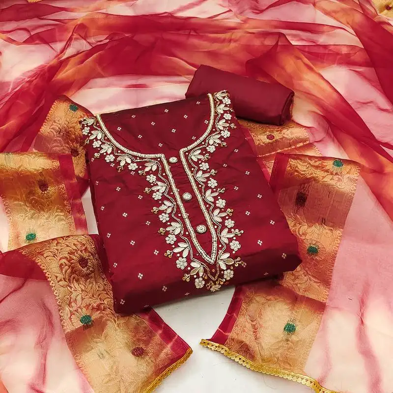 Yellow organza embroidery work designer salwar suit semi stitched