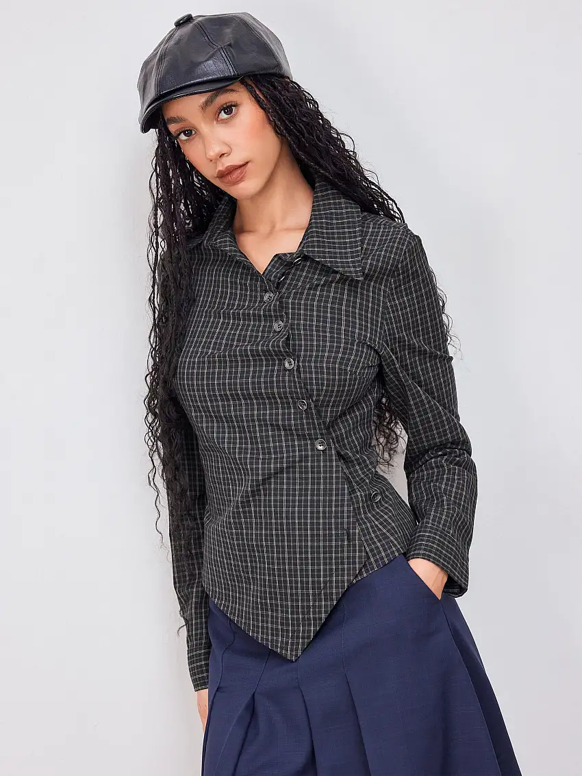 Sale!100% Cotton Collar Check Asymmetrical Wrap Blouse