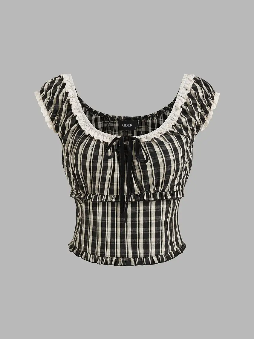Sale!100% Cotton Check Knotted Lettuce Trim Shirred Top