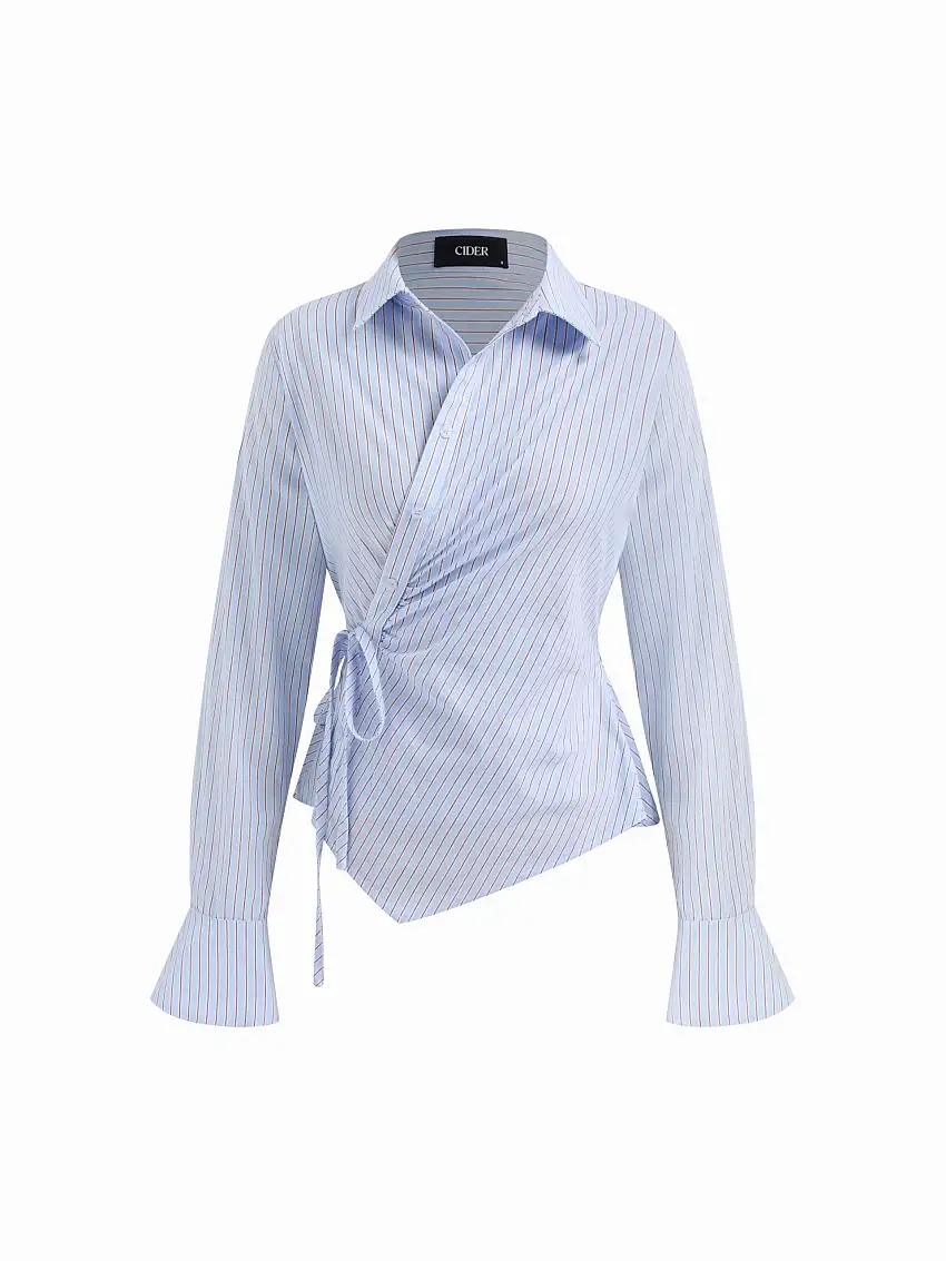 Sale!100% Cotton Collar Asymmetrical Hem Tie Side Ruched Blouse